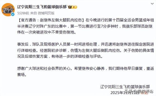 辽宁男篮官方:赵继伟诊断左侧大腿肌肉拉伤后续恢复需详细检查