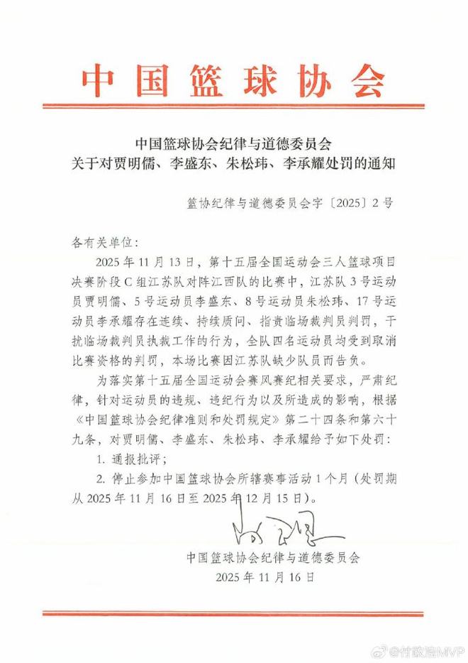 昨晚9点罚单来了,中国篮协公布重磅罚单。除了对贾明儒、李盛东、朱松玮、李承耀给予通报外,还停止他们参加中国篮球协会所辖赛事活动1个月(处罚期从2025年11月16日至2025年12月15日)。看来这四人已经铁定缺席2026俱乐部杯12月份的比赛,联赛第一轮的比赛也打不了。
