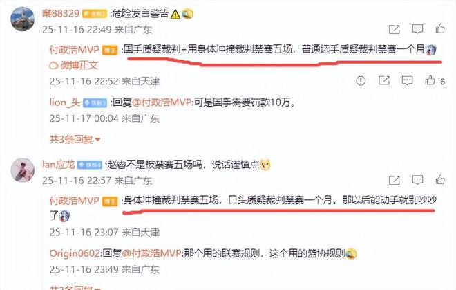 这份重磅罚单也引起热议,有人认为对不尊重裁判的行为就该严惩。但也有人认为处罚重了。知名媒体人付政浩就认为处罚过重了。他在与网友互动时说,“国手质疑裁判+用身体冲撞裁判禁赛五场,普通选手质疑裁判禁赛一个月。”显然付政浩暗指的是赵睿,赵睿曾在新疆主场,严重质疑裁判吹判,并用身体冲撞裁判,才禁赛五场。付政浩指出,“身体冲撞裁判禁赛五场,口头质疑裁判禁赛一个月。那以后能动手就别吵吵了”显然付政浩有些嘲讽的口忽,意思是与赵睿的处罚相比有过分了。