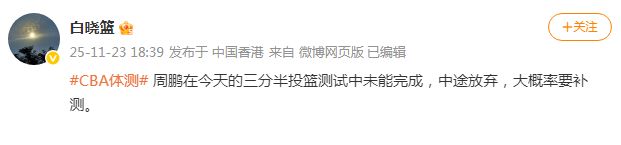 新赛季CBA体测火热进行,根据媒体人白晓篮报道,深圳男篮老将兼主帅周鹏在三分半钟投篮测试中,遗憾未能完成,他选择中途放弃,因而大概率需要参加补测。CBA体测改革采取全新方式,新赛