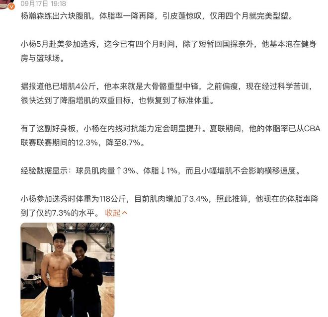 有媒体人做了一个数据统计,当初杨瀚森在夏季联赛期间,他的体脂率从12.3%降到了8.7%。而如今经过这段时间的增肌训练之后,他的肌肉水平应该降到了7.3%的水平。因为在他的肌肉增长到3.4%之后,他的体脂率会相对的下降一些。按照杨瀚森现在的体重数据,他的体重其实已经超越了火箭队的申京,直逼他的偶像约基奇。