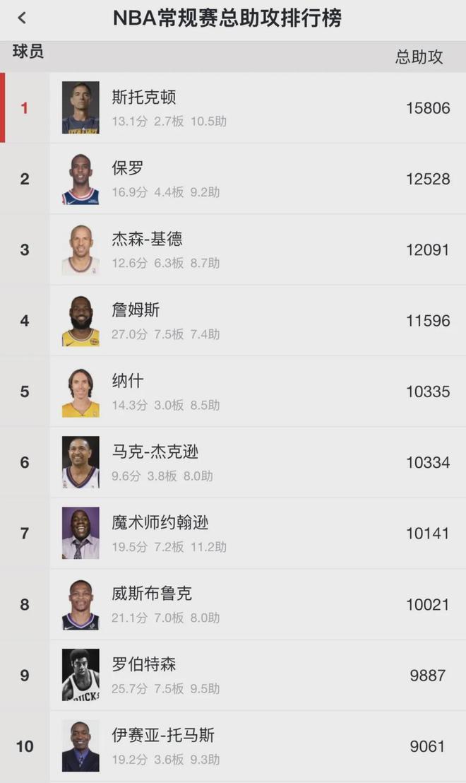 NBA历史总助攻榜和总抢断榜,保罗皆排名第二,仅次于斯托克顿。保罗生涯效力过七支球队:快船(7个赛季)、黄蜂(6个赛季)、太阳(3个赛季)、火箭(2个赛季)、雷霆(1个赛季)、勇士(1个赛季)、马刺(1个赛季)。