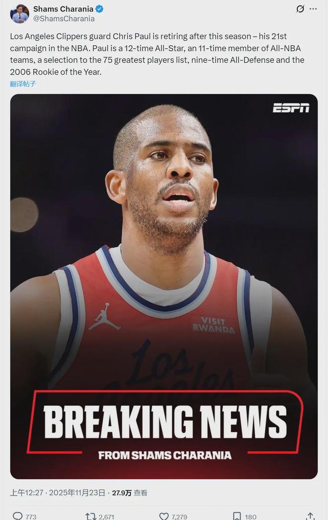 北京时间11月23日凌晨,NBA名记Shams报道,快船后卫克里斯-保罗宣布,将在本赛季结束后正式退役,结束21年生涯。今天快船对阵黄蜂,保罗回到自己的家乡北卡罗来纳州:“多么精彩的一段旅程,依然有许多不舍,感激这最后一程。”