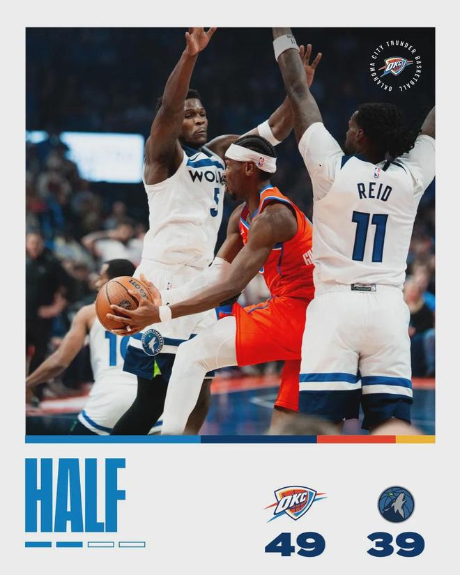 半场战罢,雷霆49-39领先森林狼10分,有点十几年前常规赛的感觉了。第三节开始,森林狼疯狂追分,打了半节追平了。多尔特和华莱士两记三分,雷霆再次领先。华子跟里德各一记大帽被吹犯规,但森林狼早早把挑战用完了。