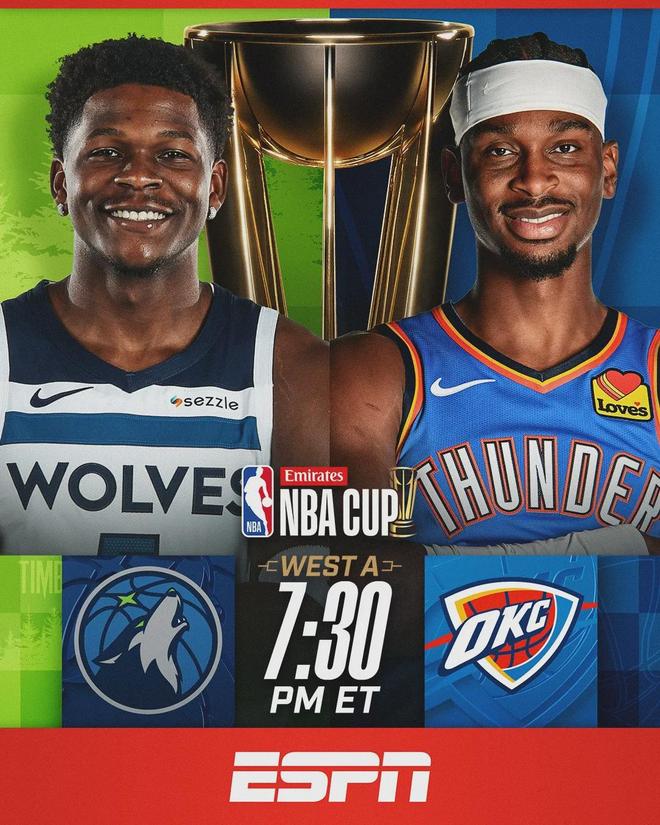 北京时间11月27日,NBA杯小组赛:雷霆主场vs森林狼。再解释一下NBA杯的规则:30支球队分成6个小组(东西分区各3个小组),每个小组第一名和东西分区各一支外卡球队晋级八强。所谓外卡球