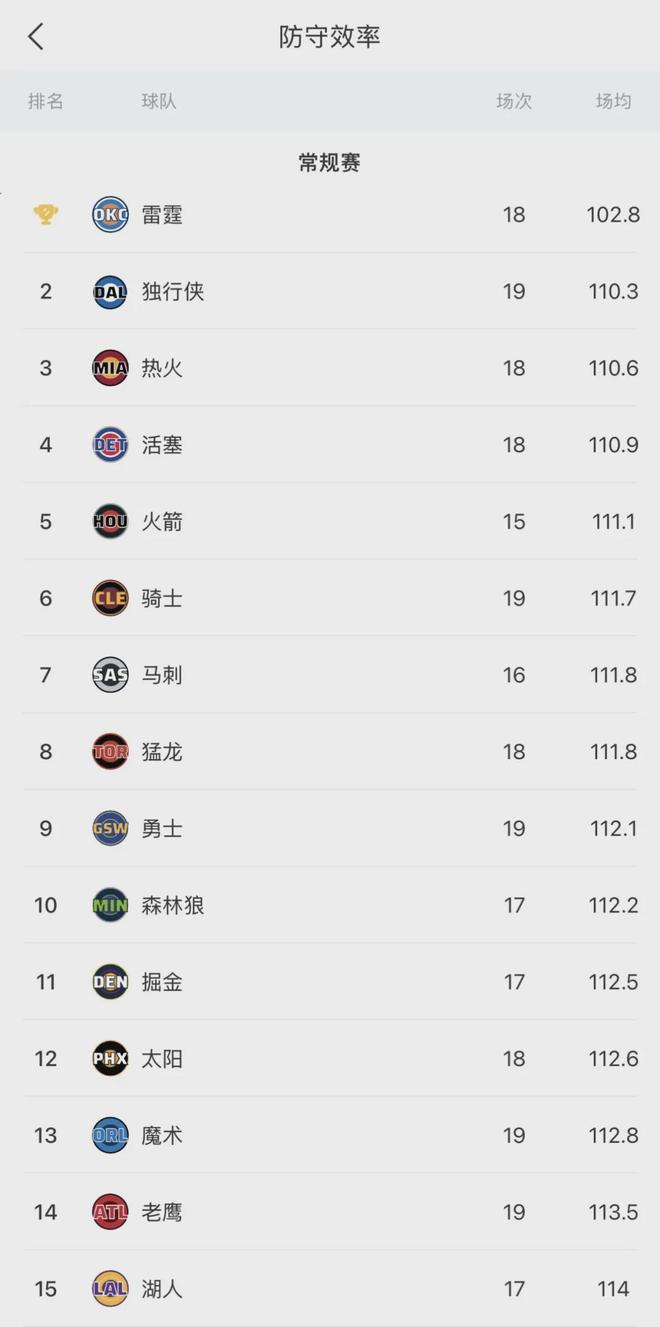 截至今天赛前,雷霆17胜1负稳居联盟第一,领先东部第一的活塞2个胜场,领先西部第二的湖人3.5个胜场。此外,雷霆本赛季防守效率102.8,断层式领跑全联盟。独行侠防守效率110.3,联盟第二;热火110.6,联盟第三。