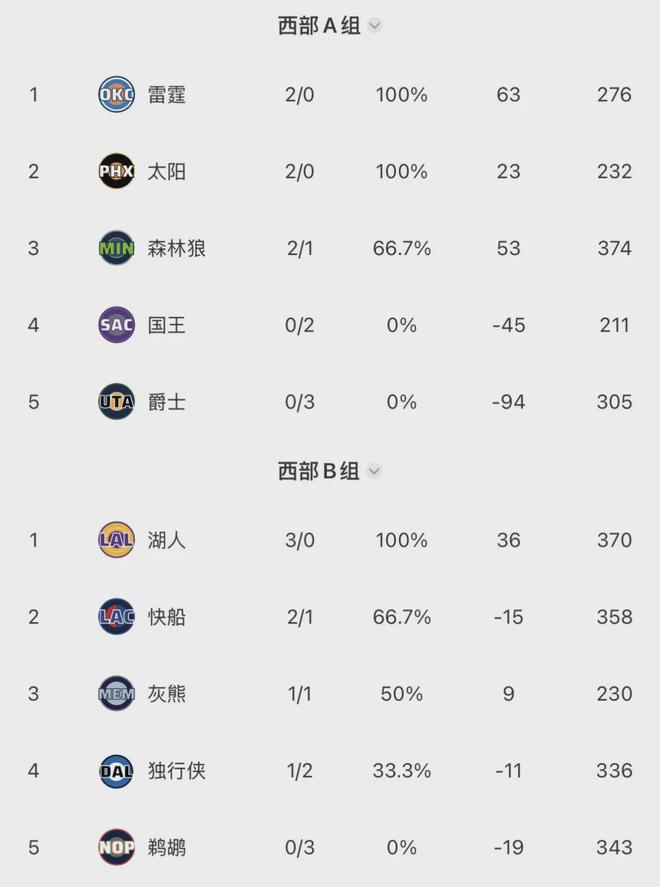 只要进入淘汰赛,就能拿到奖金:八强5.3万美元、四强10.6万、亚军21.2万、冠军53.1万。雷霆、太阳、森林狼、国王和爵士同在西部A组,雷霆和太阳2胜0负,森林狼则是2胜1负。除了决赛之外,其余杯赛都算常规赛战绩。