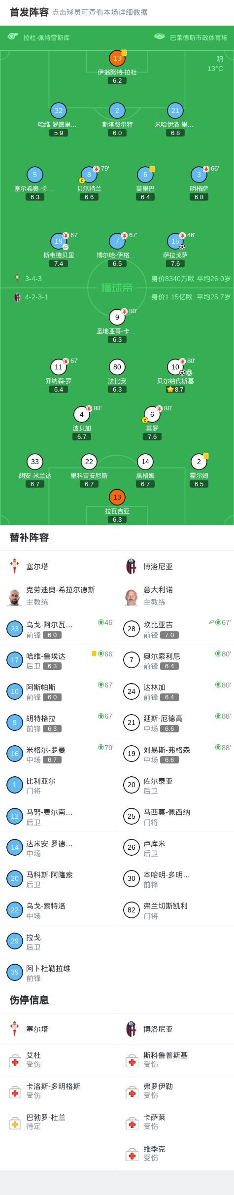 - 北京时间12月12日,欧足联欧洲联赛联赛阶段第六轮展开较量,塞尔塔迎战博洛尼亚。上半场,斯韦德贝里送出助攻,萨拉...发表于: 12-13 08:49