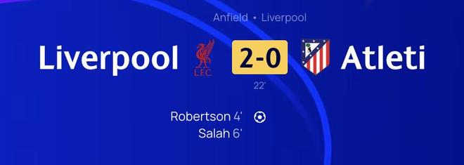 欧冠联赛阶段第一轮,利物浦主场对阵马德里竞技,开场不到5分钟,罗伯逊破门为利物浦取得领先,时隔6年再度在欧冠赛场进球。此役主场对阵马德里竞技,比赛第4分钟,萨拉赫任意球攻门,皮