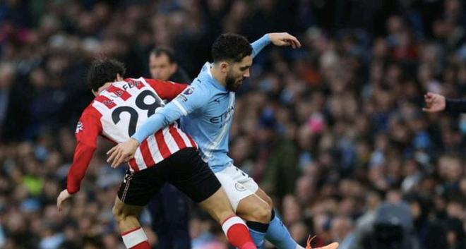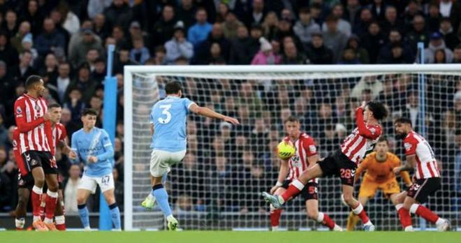 面对来势汹汹的桑德兰,曼城从比赛一开始就展现出了强大的控制力。他们利用娴熟的传控和不断的跑动,将比赛节奏牢牢掌握在自己手中。尽管桑德兰的防守组织严密,试图通过密集的防守来限制曼城的进攻空间,但在蓝月军团持续的压力下,球门失守只是时间问题。第31分钟,僵局被以一种极具观赏性的方式打破。曼城后防大将鲁本·迪亚斯在中场附近接到皮球,稍作调整后,他突然起脚远射。皮球如同一出膛的炮弹,带着强烈的旋转直挂球门死角,对方门将对此毫无反应。这记惊世骇俗的世界波,不仅为曼城取得了领先,也彻底点燃了主场的气氛。